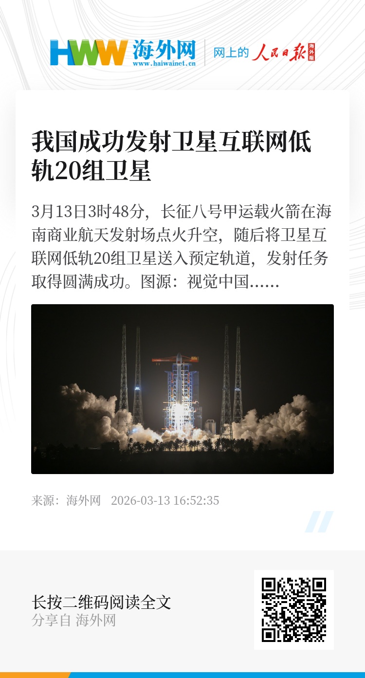 32937768,.我国成功发射卫星互联网低轨20组卫星,.2026-03-13 16:52:35,.204589,.黄之安、侯兴川