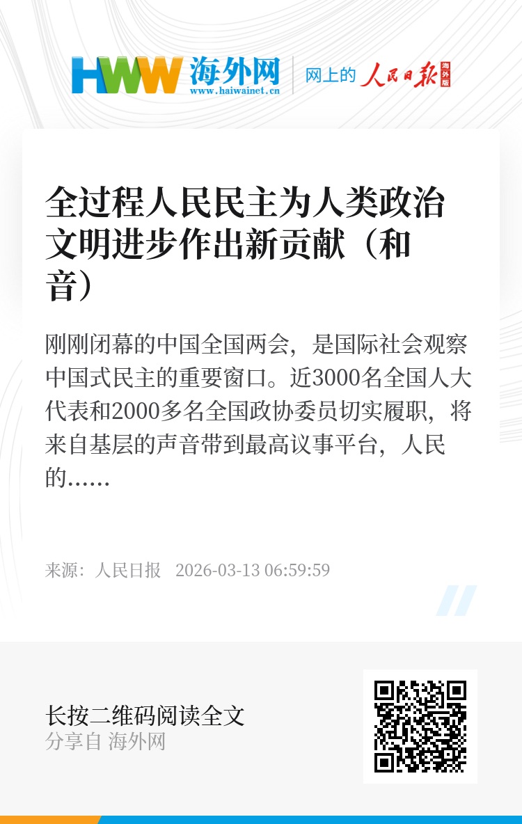 刚刚闭幕的中国全国两会,是国际社会观察中国式民主的重要窗口。近3000名全国人大代表和2000多名全国政协委员切实履职,将来自基层的声音带到最高议事平台,人民的所思所盼深刻融入国家发展的顶层设计,充分彰显全过程人民民主的蓬勃生命力。