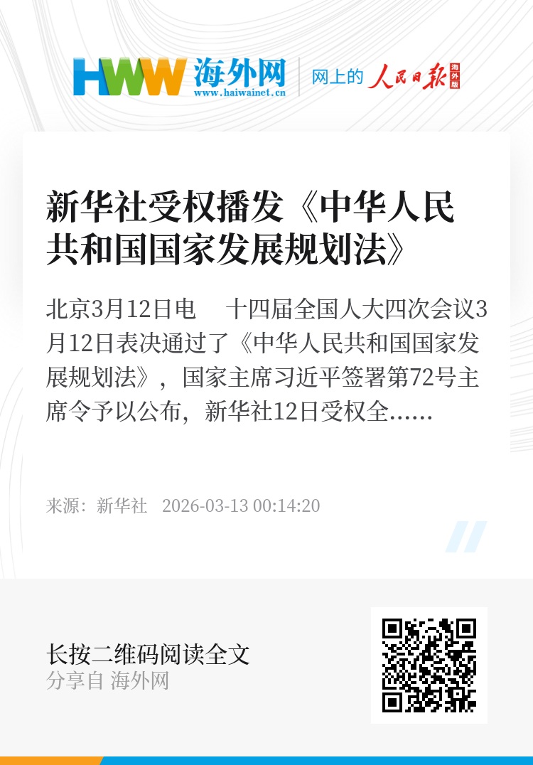 新华社北京3月12日电 十四届全国人大四次会议3月12日表决通过了《中华人民共和国国家发展规划法》,国家主席习近平签署第72号主席令予以公布,新华社12日受权全文播发这部法律。