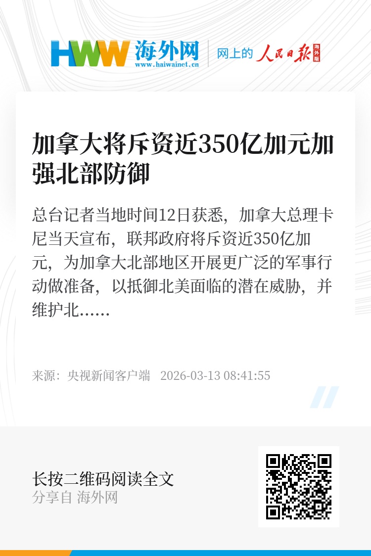 总台记者当地时间12日获悉,加拿大总理卡尼当天宣布,联邦政府将斥资近350亿加元,为加拿大北部地区开展更广泛的军事行动做准备,以抵御北美面临的潜在威胁,并维护北极地区的领土主权。