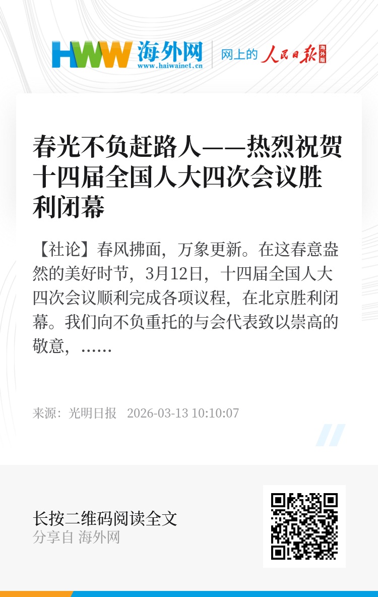 在这场春天的盛会里,会场内外,党心民心同频共振,政声民意交融共鸣。人们为经济增速设定区间目标喝彩,掌声中饱含对高质量发展的信心与期待;“一老一小”照护难题、新就业群体权益保障等问题得到政策照拂,扑面而来的民生暖意激荡起团结奋进的力量;西海固农民作家马慧娟代表带来的“铁杆庄稼”故事引热议,来自不同地区、领域的代表们共话“文化热”;“苏超”“东北超”等代言的“新大众体育”成为两会高频词。这些,让人们触摸到文化繁荣与自信的强劲脉动。