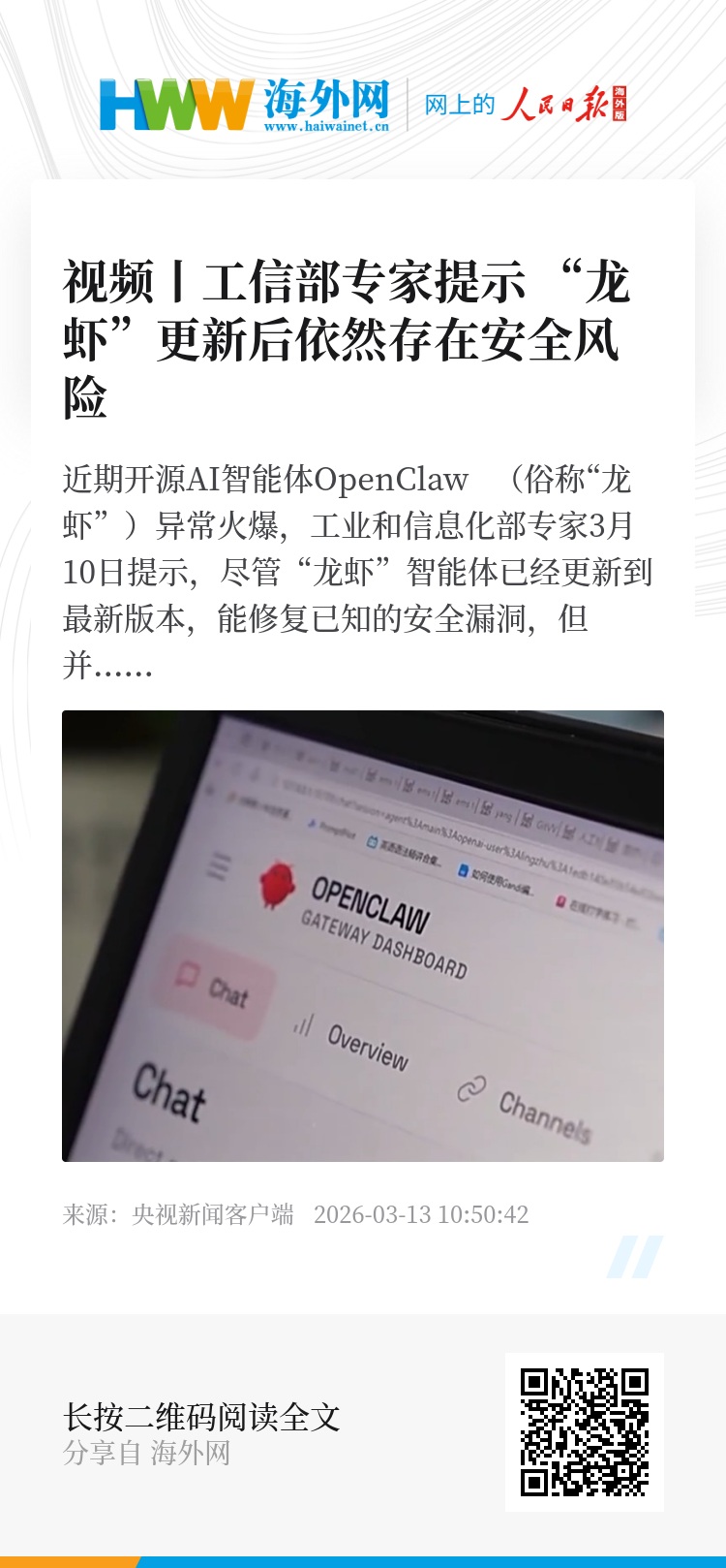 近期开源AI智能体OpenClaw (俗称“龙虾”)异常火爆,工业和信息化部专家3月10日提示,尽管“龙虾”智能体已经更新到最新版本,能修复已知的安全漏洞,但并不意味着完全消除安全风险。