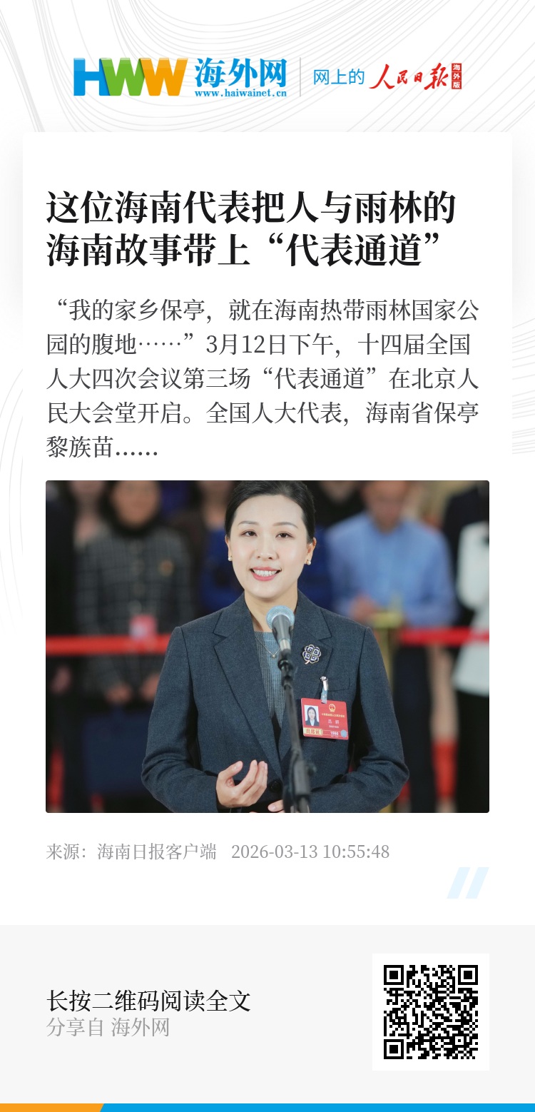 “我的家乡保亭,就在海南热带雨林国家公园的腹地……”3月12日下午,十四届全国人大四次会议第三场“代表通道”在北京人民大会堂开启。全国人大代表,海南省保亭黎族苗族自治县委常委、副县长吕妍走上“代表通道”,讲述海南热带雨林里人与自然和谐共生的故事。