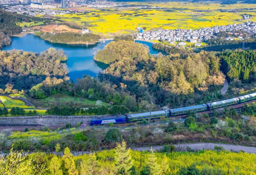 铁龙踏春行,金浪逐风涌。南昆铁路串起云南罗平百万亩油菜花的金黄,山作屏,水为带。车窗外,每一眼都是滇东北大地动人的春意。