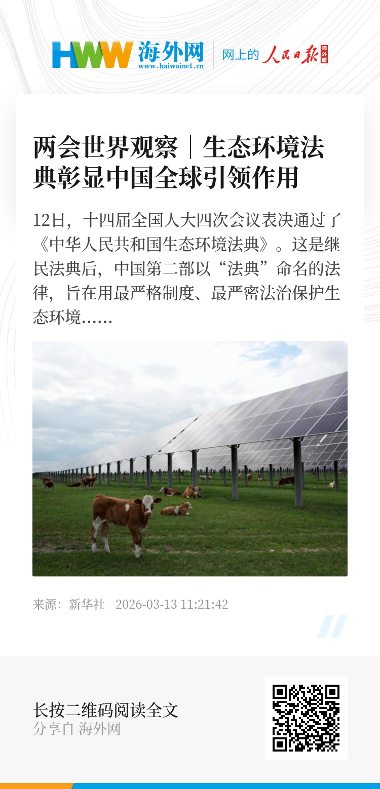 立善法于天下,则天下治。海外专家关注到,中国生态环境法典不仅整合国内制度,也注重衔接国际环境法治成果,为中国在气候变化治理等领域作出持续贡献提供法律指引和保障。