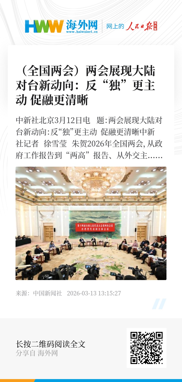 2026年全国两会,从政府工作报告到“两高”报告、从外交主题记者会到会议现场,“坚决打击‘台独’分裂势力”“深化两岸交流合作和融合发展”等表述备受关注。