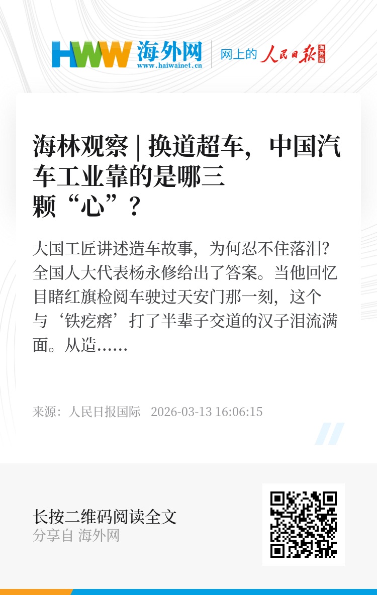 大国工匠讲述造车故事,为何忍不住落泪? 全国人大代表杨永修给出了答案。当他回忆目睹红旗检阅车驶过天安门那一刻,这个与‘铁疙瘩’打了半辈子交道的汉子泪流满面。从造车报国的初心,到千亿攻坚的决心,再到终身学习的恒心——本期海林观察拆解中国汽车“换道超车”背后的三颗“心”。
