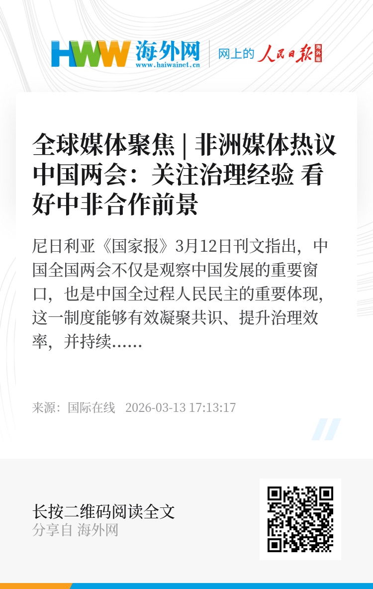 尼日利亚《国家报》3月12日刊文指出,中国全国两会不仅是观察中国发展的重要窗口,也是中国全过程人民民主的重要体现,这一制度能够有效凝聚共识、提升治理效率,并持续推动经济社会发展。