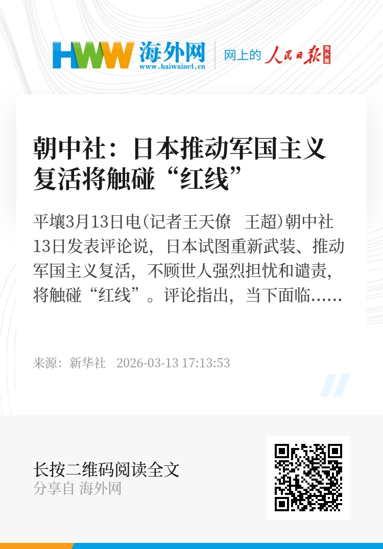 新华社平壤3月13日电(记者王天僚 王超)朝中社13日发表评论说,日本试图重新武装、推动军国主义复活,不顾世人强烈担忧和谴责,将触碰“红线”。