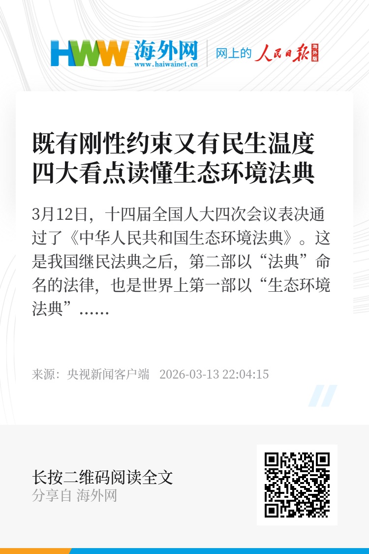 3月12日,十四届全国人大四次会议表决通过了《中华人民共和国生态环境法典》。这是我国继民法典之后,第二部以“法典”命名的法律,也是世界上第一部以“生态环境法典”命名的法律。专家梳理了四大核心看点,一起来了解。