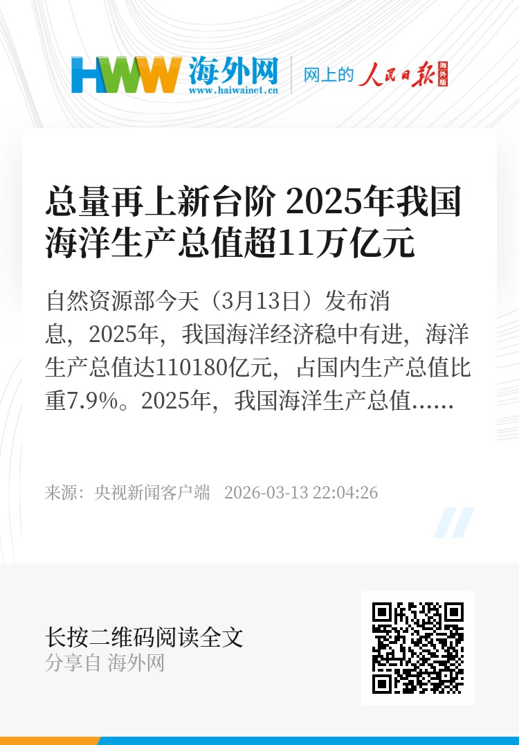 自然资源部今天(3月13日)发布消息,2025年,我国海洋经济稳中有进,海洋生产总值达110180亿元,占国内生产总值比重7.9%。
