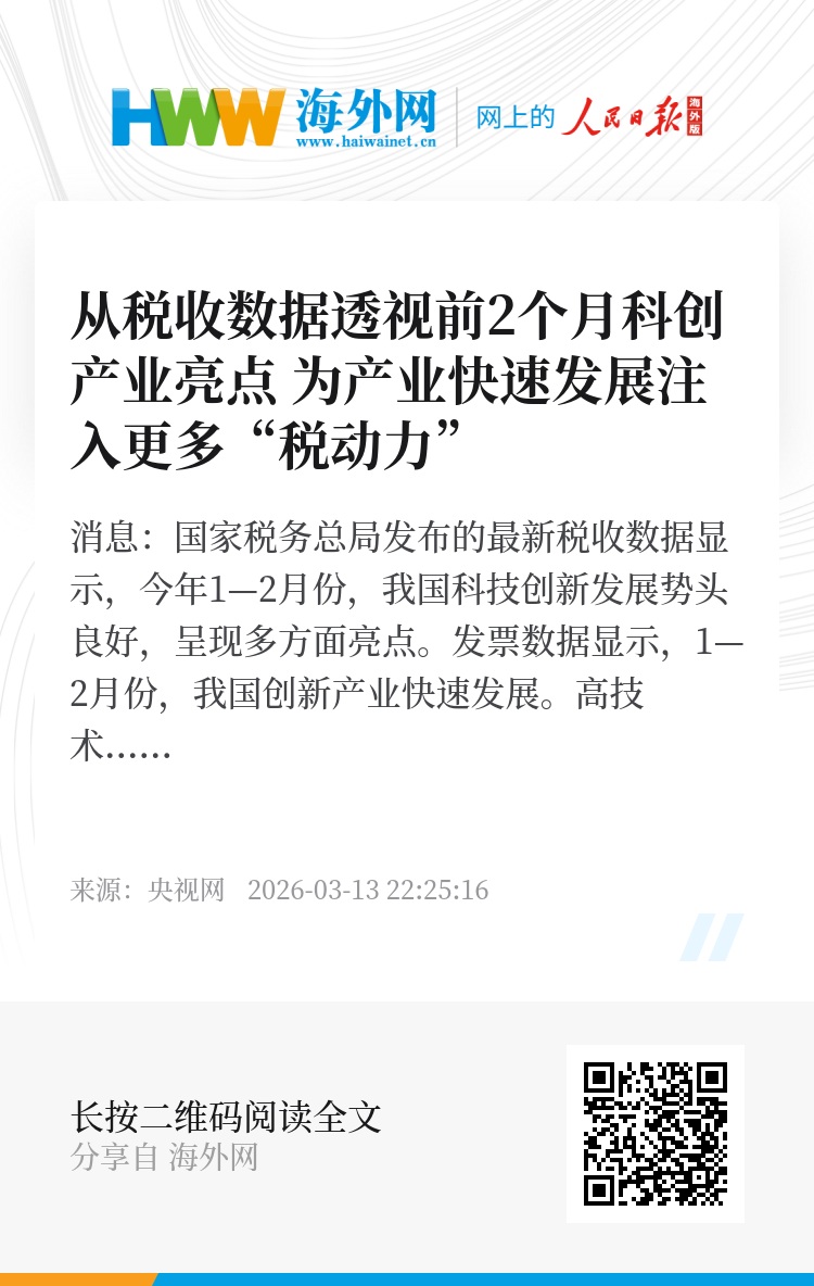 央视网消息:国家税务总局发布的最新税收数据显示,今年1—2月份,我国科技创新发展势头良好,呈现多方面亮点。