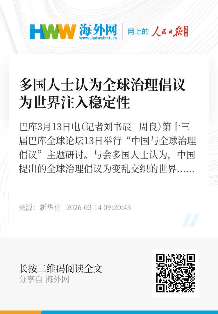 新华社巴库3月13日电(记者刘书辰 周良)第十三届巴库全球论坛13日举行“中国与全球治理倡议”主题研讨。与会多国人士认为,中国提出的全球治理倡议为变乱交织的世界注入稳定性。