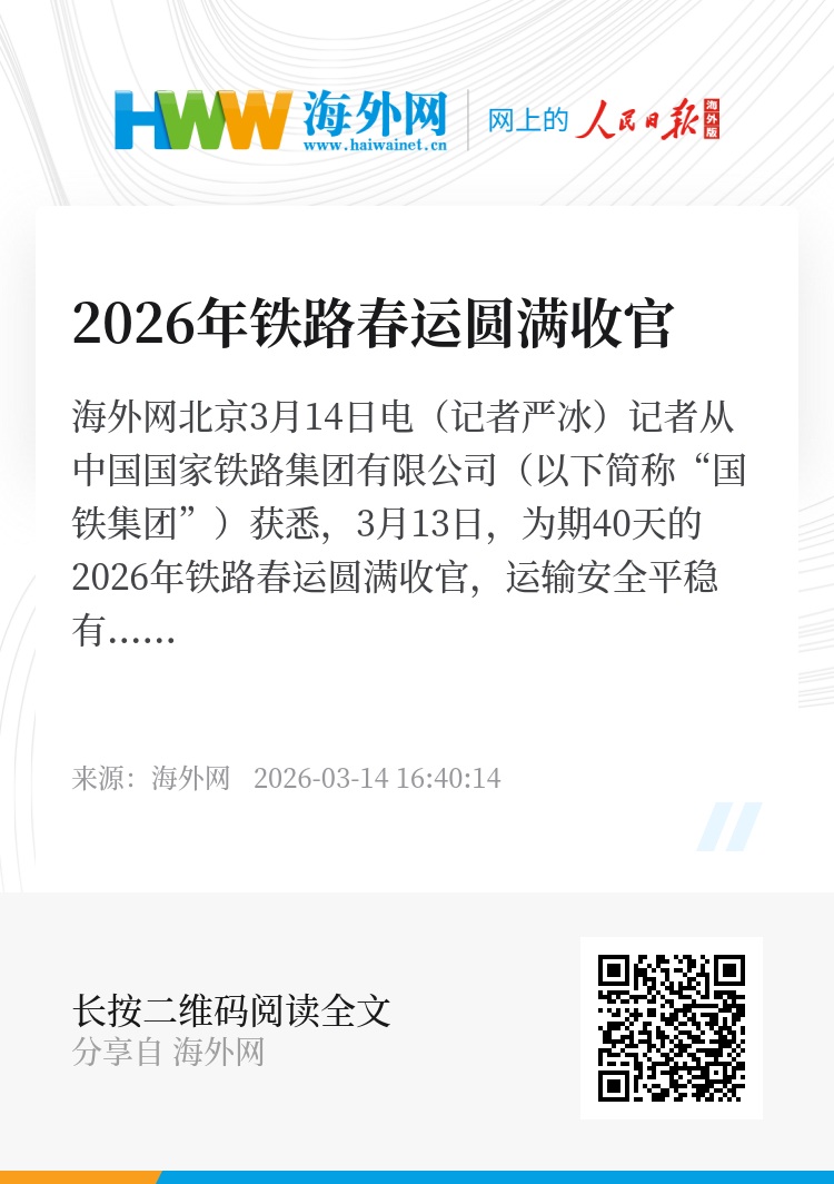 海外网北京3月14日电(记者严冰)记者从中国国家铁路集团有限公司(以下简称“国铁集团”)获悉,3月13日,为期40天的2026年铁路春运圆满收官,运输安全平稳有序,全国铁路累计发送旅客5.38亿人次,同比增长4.8%,国家铁路累计发送货物4.24亿吨,同比增长2.1%,客货运输多项指标创春运同期历史新高。