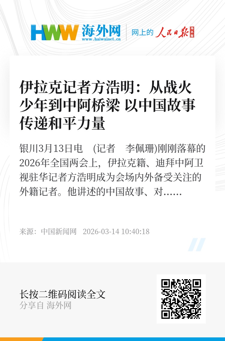 中新网银川3月13日电 (记者 李佩珊)刚刚落幕的2026年全国两会上,伊拉克籍、迪拜中阿卫视驻华记者方浩明成为会场内外备受关注的外籍记者。他讲述的中国故事、对和平的真挚心声经媒体传播后引发海内外广泛关注,成为两会期间的热点人物。