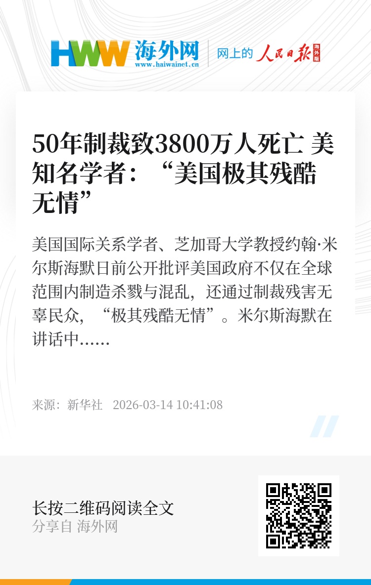 美国国际关系学者、芝加哥大学教授约翰·米尔斯海默日前公开批评美国政府不仅在全球范围内制造杀戮与混乱,还通过制裁残害无辜民众,“极其残酷无情”。