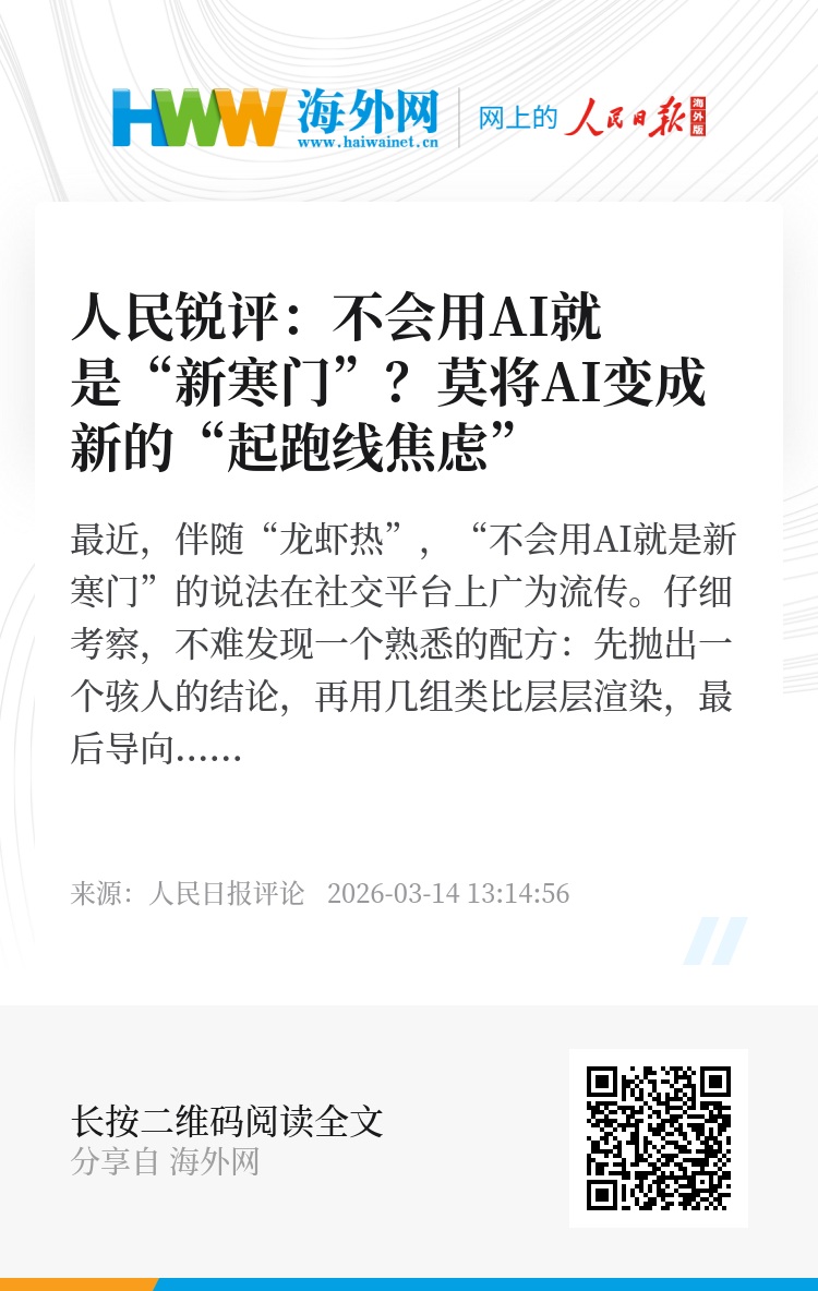 最近,伴随“龙虾热”,“不会用AI就是新寒门”的说法在社交平台上广为流传。仔细考察,不难发现一个熟悉的配方:先抛出一个骇人的结论,再用几组类比层层渲染,最后导向一个付费课程或培训项目。起跑线焦虑过去绑定的是学区房和奥数班等,如今不过换了一身AI的行头。