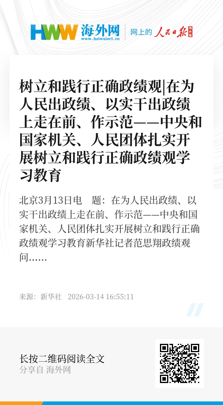 新华社北京3月13日电 题:在为人民出政绩、以实干出政绩上走在前、作示范——中央和国家机关、人民团体扎实开展树立和践行正确政绩观学习教育