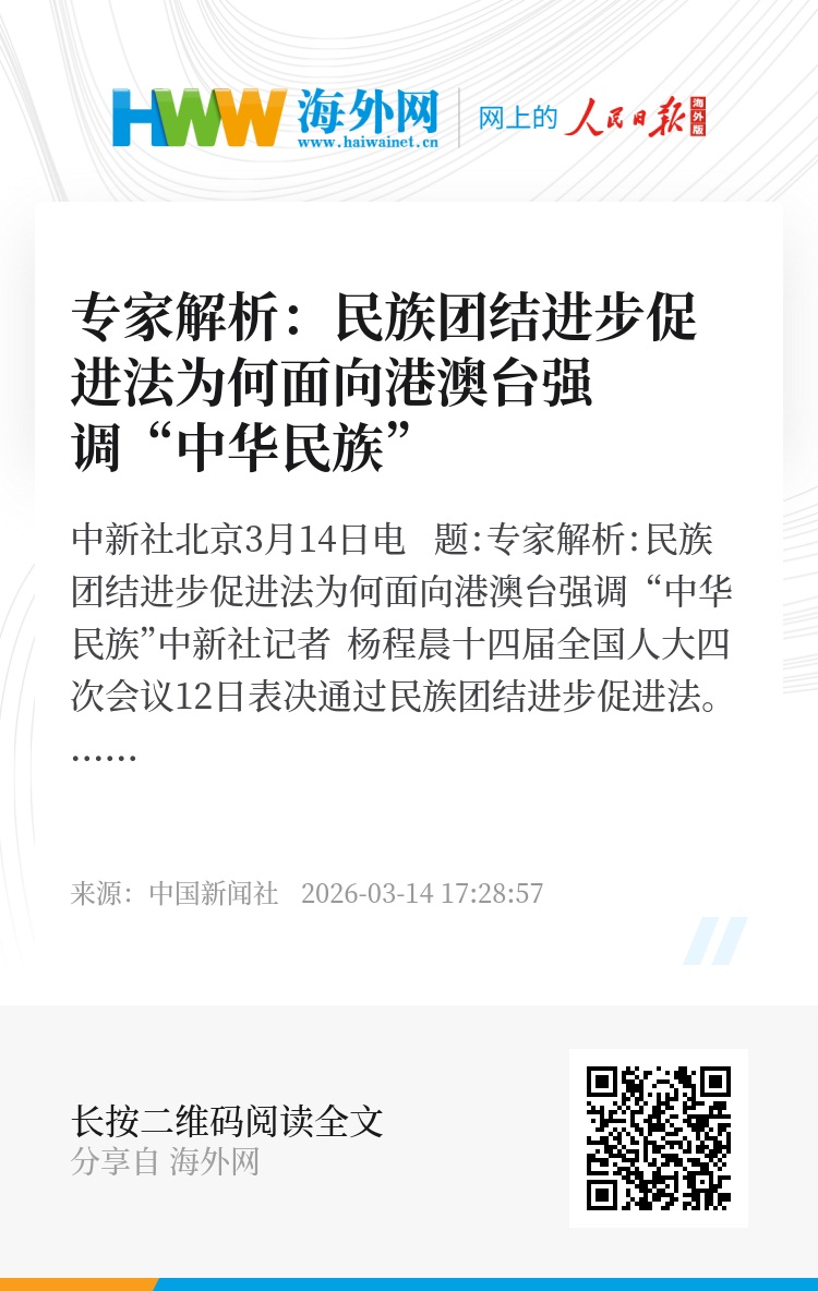 中新社北京3月14日电 题:专家解析:民族团结进步促进法为何面向港澳台强调“中华民族”