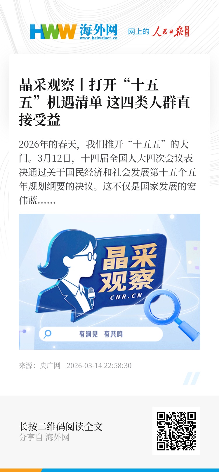 “十五五”的机遇清单,聚焦从“投资于物”转向“投资于人”。无论是“一老一小”的温情守护,还是新职业的赋能保障,我想都指向一个目标——让我们每个人在时代发展中,找到属于自己的位置。