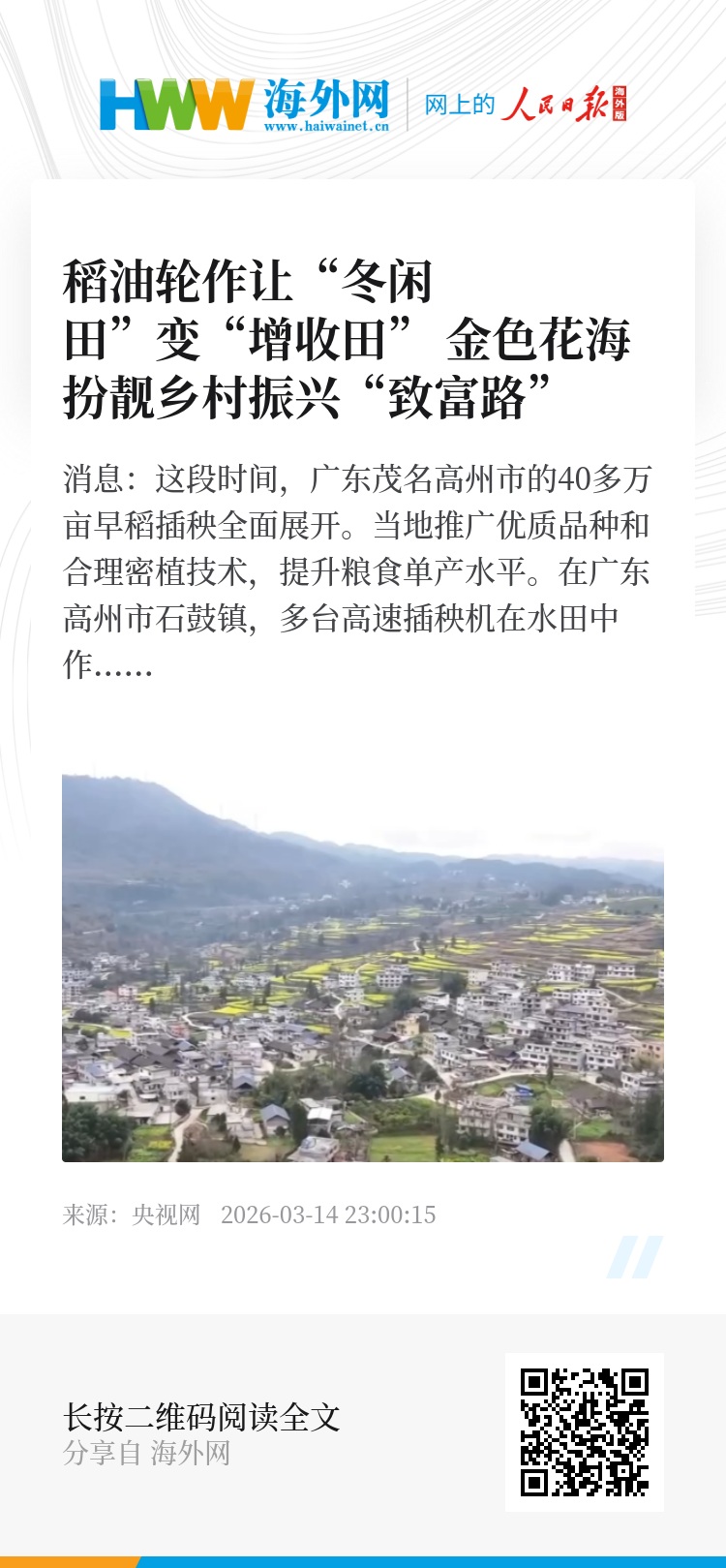 央视网消息:这段时间,广东茂名高州市的40多万亩早稻插秧全面展开。当地推广优质品种和合理密植技术,提升粮食单产水平。