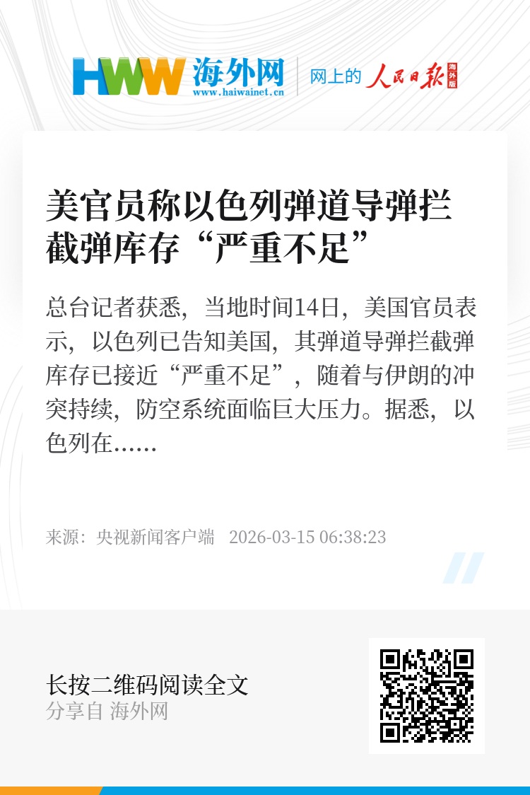 总台记者获悉,当地时间14日,美国官员表示,以色列已告知美国,其弹道导弹拦截弹库存已接近“严重不足”,随着与伊朗的冲突持续,防空系统面临巨大压力。据悉,以色列在当前战争爆发前库存已偏低。