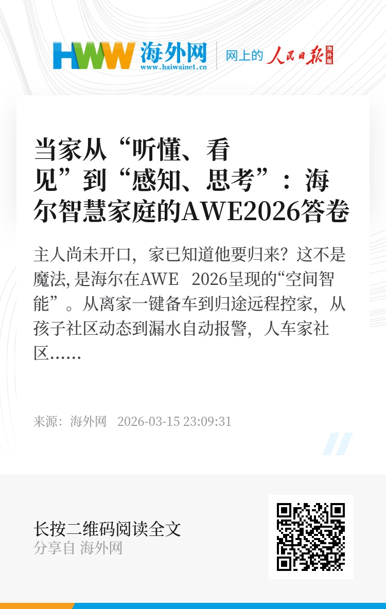 主人尚未开口,家已知道他要归来?这不是魔法,是海尔在AWE 2026呈现的“空间智能”。从离家一键备车到归途远程控家,从孩子社区动态到漏水自动报警,人车家社区全场景打通。3D数字孪生让家庭管理从“翻列表”到“看房子”,热成像系统感知静坐或跌倒,AI穿搭助手主动服务出门一刻。像小度眼镜等生态接入后,空间交互有了更多形式——所见即可控,所言即可达。这是一个能感知、会思考的家。