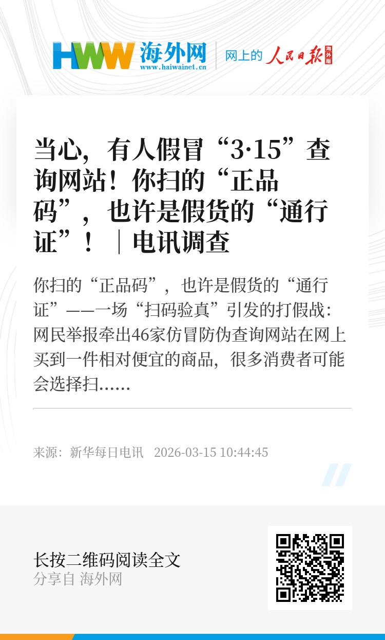 在消费场景日益多元化的今天,“扫码验真”不该成为消费者一场碰运气的“赌博”。从“扫码安心”到“消费放心”,不仅需要相关监管部门持续发力,更需要全社会共同织就一张让假冒伪劣无处藏身的“防护网”。“欢迎更多网民成为我们的‘眼睛’,发挥共治的作用,共同守护清朗的网络消费环境。”刘涵表示,举报中心将持续畅通网络举报渠道,为消费者提供更多元、便捷的举报途径,强化仿冒假冒网站识别科普宣传,不断提升消费者的防范意识和辨别能力。同时,市场监管部门也将持续开展防伪查验网站信息监测,加强合规防伪查验渠道信息的发布,宣传和普及防伪知识,提升全社会防伪意识。(记者唐牛 张思林 王梦瑶)