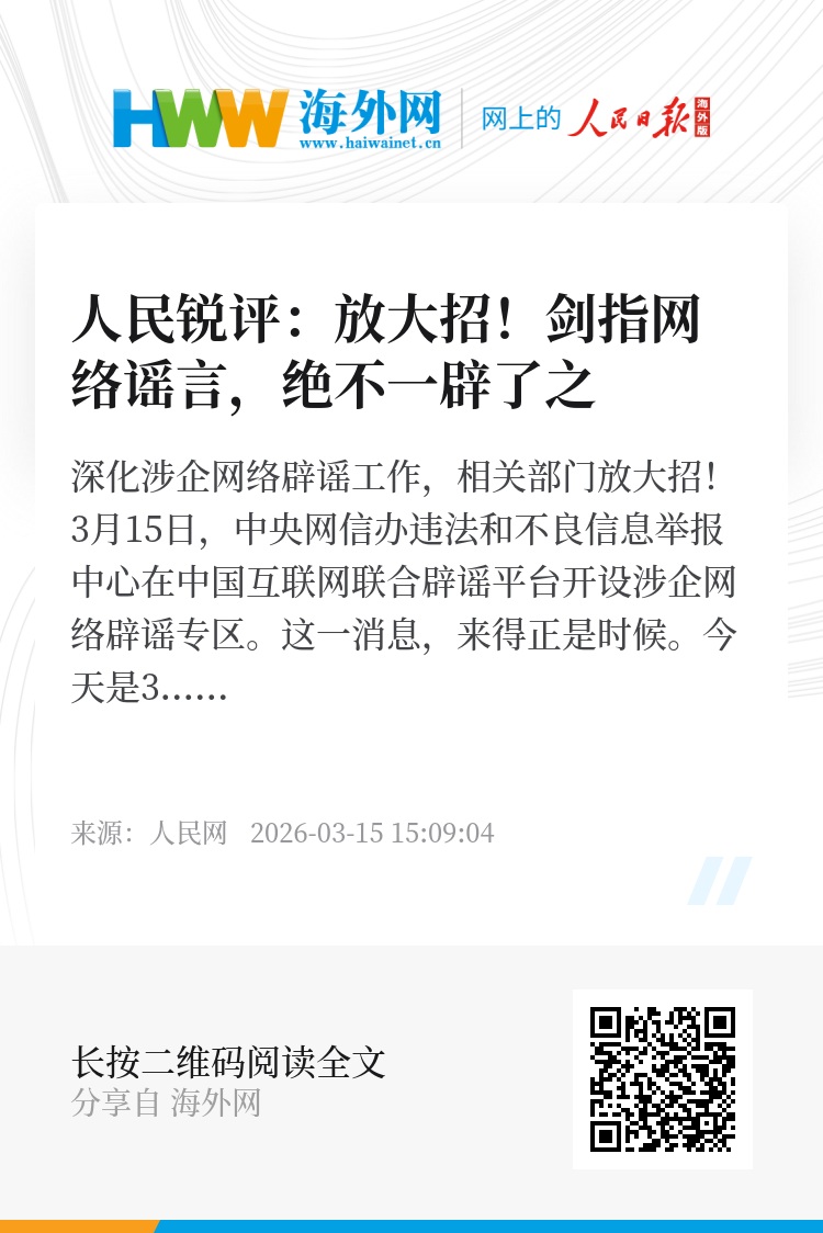 “清朗网络空间也是营商环境”。旗帜鲜明地维护企业和企业家的合法权益,是法治建设的应有之义。以辟谣专区为起点,用法治利剑斩断造谣之手,让诚信者安心经营、让创新者放心奔跑,这是我们期待看到的。(任网平)
