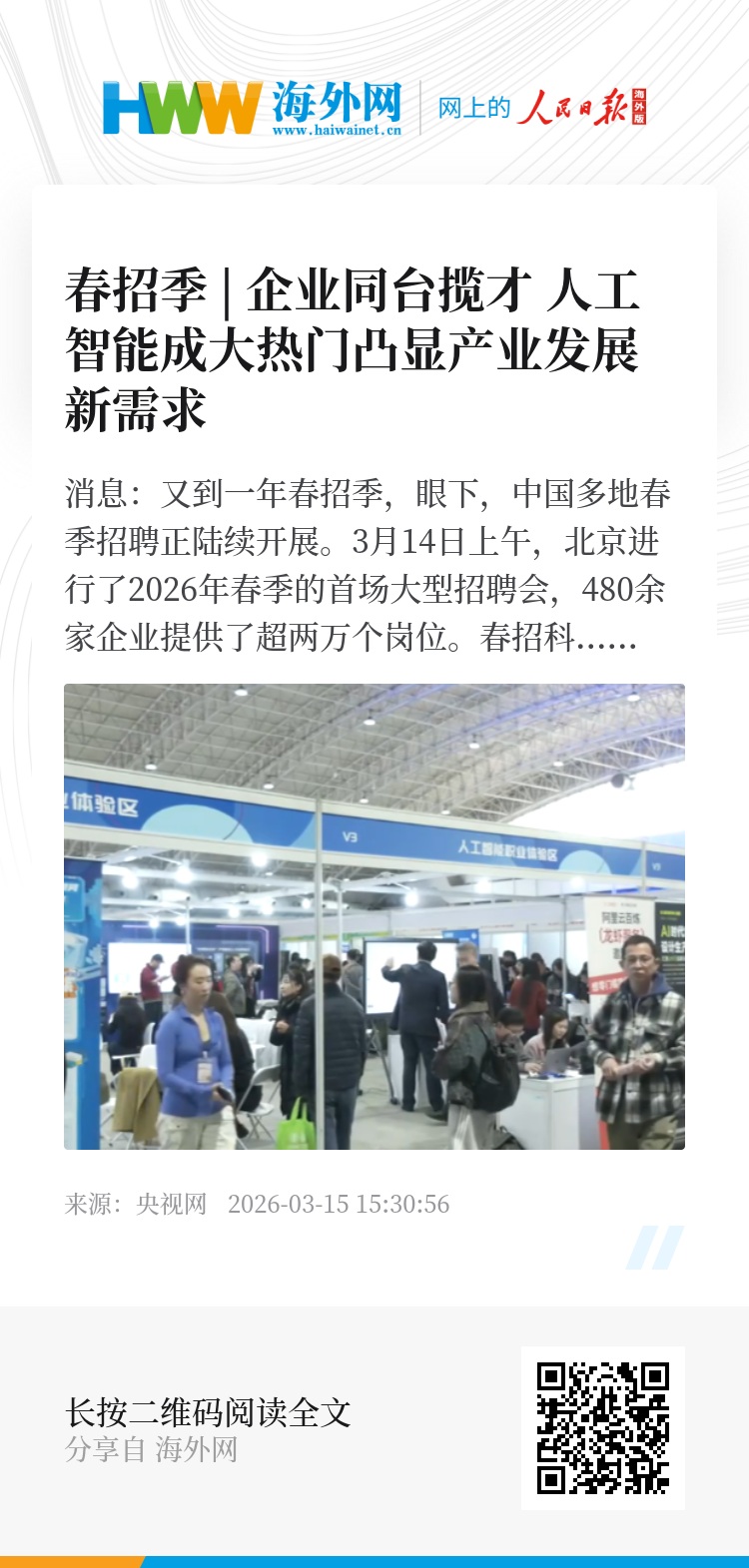 央视网消息:又到一年春招季,眼下,中国多地春季招聘正陆续开展。3月14日上午,北京进行了2026年春季的首场大型招聘会,480余家企业提供了超两万个岗位。