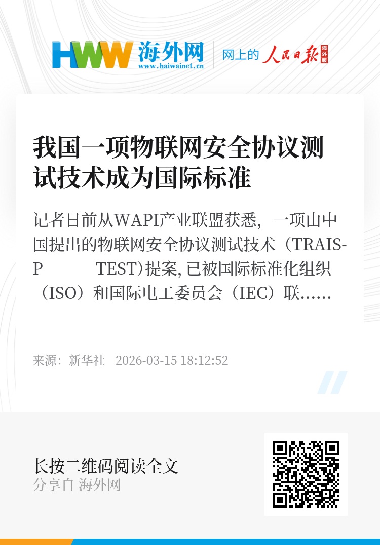 记者日前从WAPI产业联盟获悉,一项由中国提出的物联网安全协议测试技术(TRAIS-P TEST)提案,已被国际标准化组织(ISO)和国际电工委员会(IEC)联合发布成为国际标准。这是我国在物联网安全技术领域又一项拥有自主知识产权的国际标准。