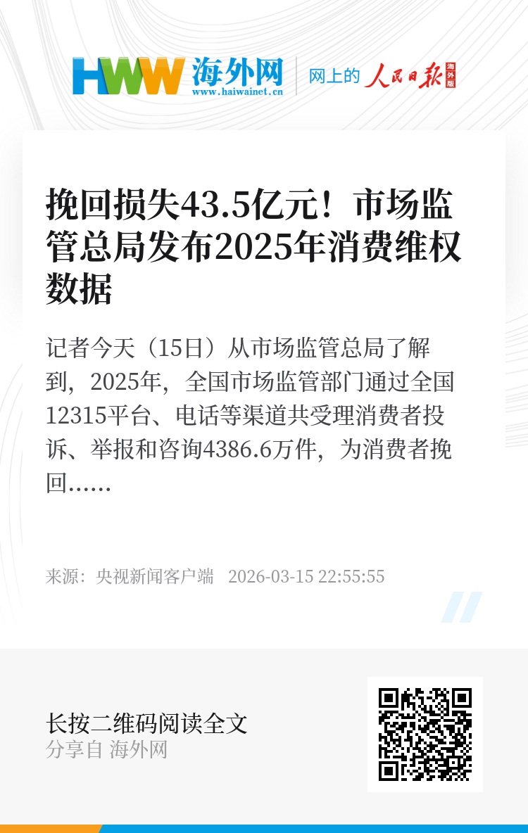 记者今天(15日)从市场监管总局了解到,2025年,全国市场监管部门通过全国12315平台、电话等渠道共受理消费者投诉、举报和咨询4386.6万件,为消费者挽回经济损失43.5亿元,有力保护了消费者合法权益。