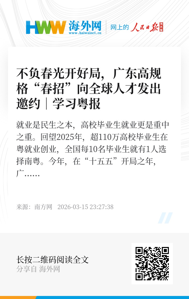 就业是民生之本,高校毕业生就业更是重中之重。回望2025年,超110万高校毕业生在粤就业创业,全国每10名毕业生就有1人选择南粤。今年,在“十五五”开局之年,广东推出2026年“百万英才汇南粤”行动计划,拟再吸纳100万以上高校毕业生。