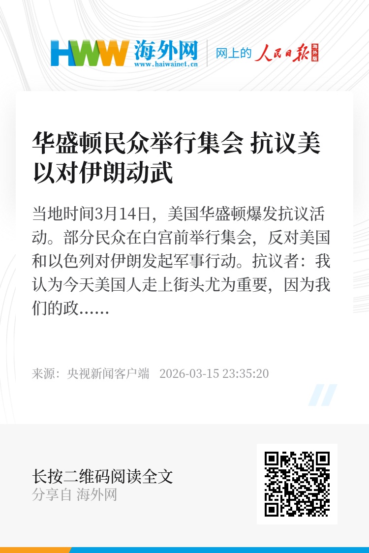 在华盛顿当地,也有居民表示,自美国和以色列对伊朗动武以来,全美汽油价格也出现大幅上涨,给普通人的生活造成影响。同时,人们也不断质疑此次对伊朗发动军事打击的合法性。