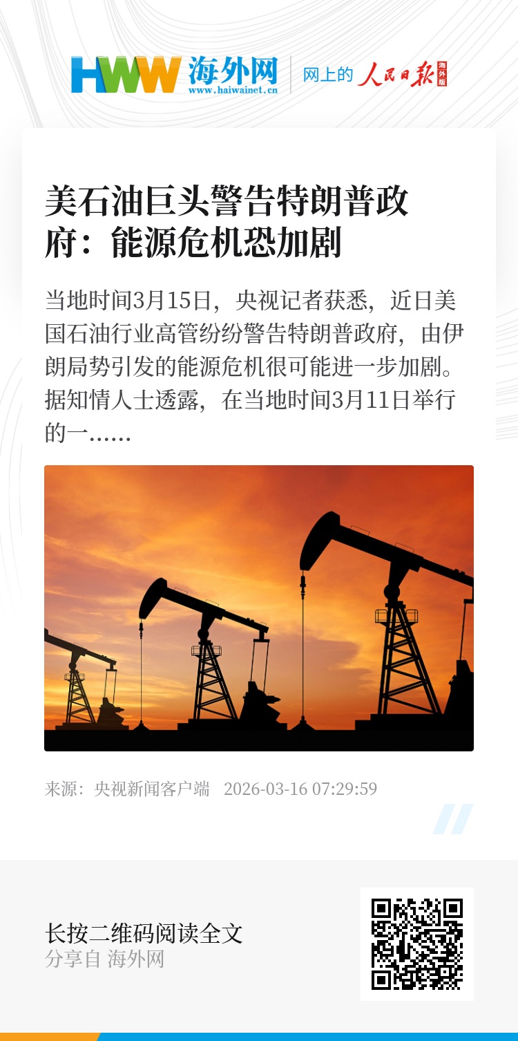 当地时间3月15日,央视记者获悉,近日美国石油行业高管纷纷警告特朗普政府,由伊朗局势引发的能源危机很可能进一步加剧。