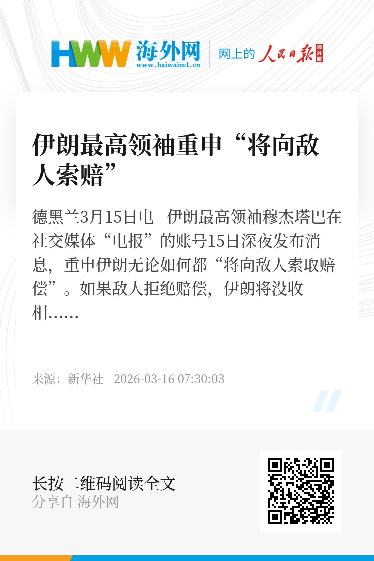 新华社德黑兰3月15日电 伊朗最高领袖穆杰塔巴在社交媒体“电报”的账号15日深夜发布消息,重申伊朗无论如何都“将向敌人索取赔偿”。如果敌人拒绝赔偿,伊朗将没收相应价值的资产;如果无法没收,伊朗将摧毁同等价值的资产。