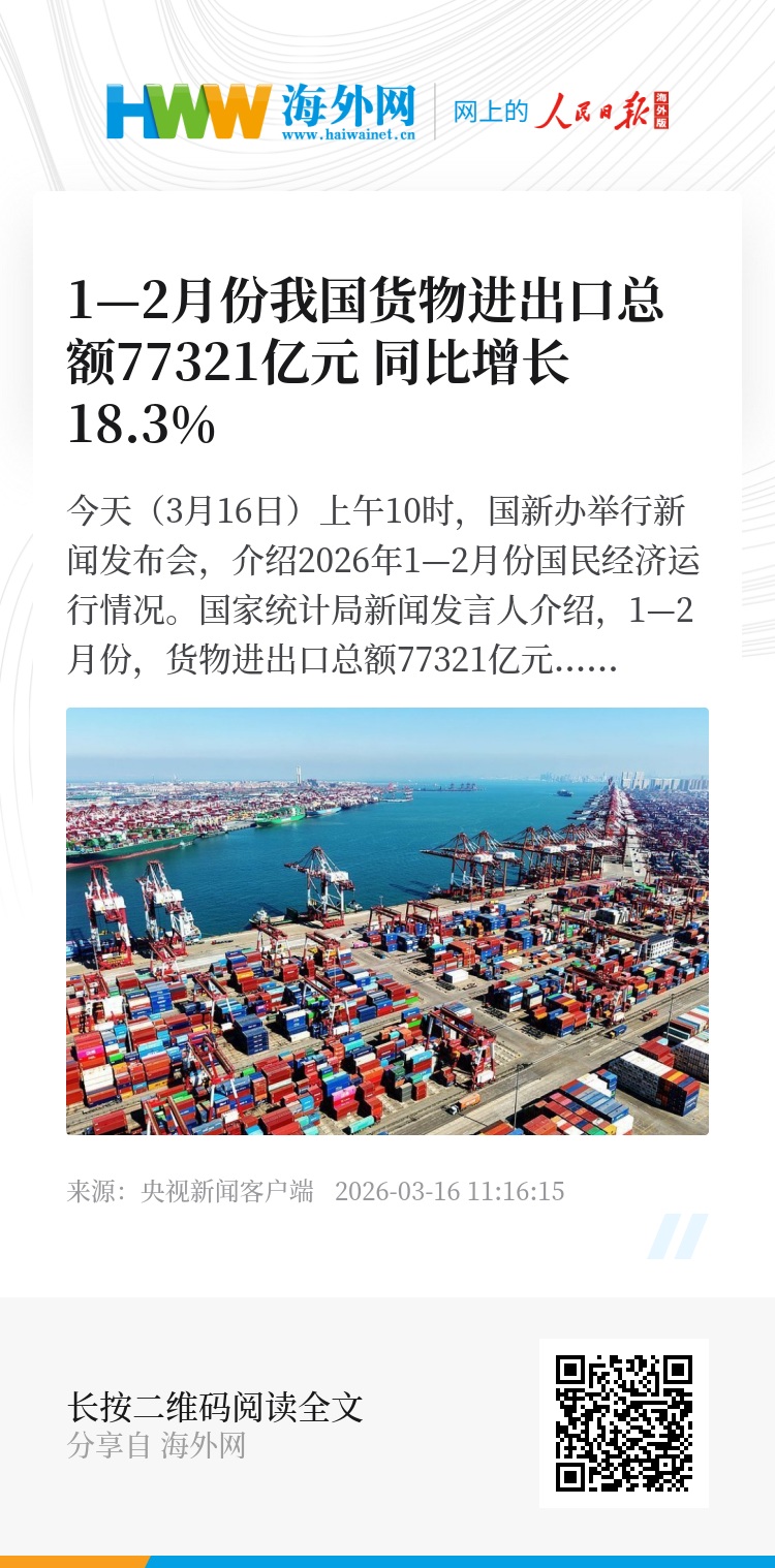 今天(3月16日)上午10时,国新办举行新闻发布会,介绍2026年1—2月份国民经济运行情况。