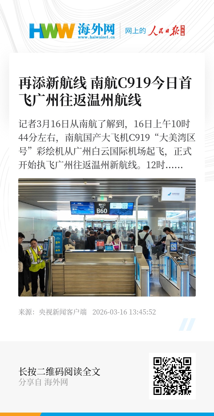 记者3月16日从南航了解到,16日上午10时44分左右,南航国产大飞机C919“大美湾区号”彩绘机从广州白云国际机场起飞,正式开始执飞广州往返温州新航线。