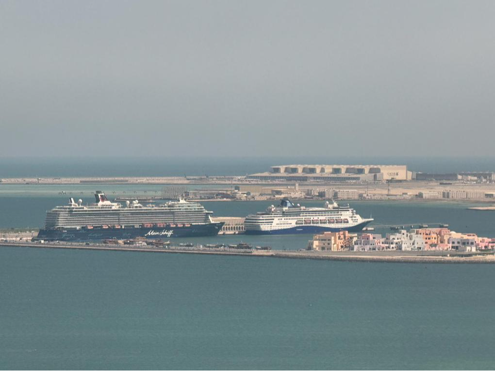 这是3月6日在卡塔尔首都多哈的港口拍摄的滞留的“迈希夫五号”邮轮(左)(手机照片)。新华社记者 汪强 摄