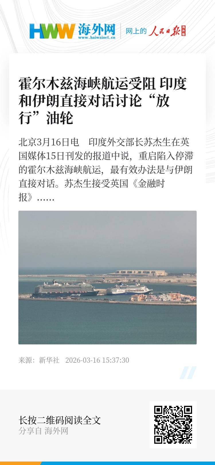 新华社北京3月16日电 印度外交部长苏杰生在英国媒体15日刊发的报道中说,重启陷入停滞的霍尔木兹海峡航运,最有效办法是与伊朗直接对话。