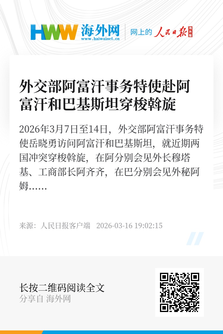 2026年3月7日至14日,外交部阿富汗事务特使岳晓勇访问阿富汗和巴基斯坦,就近期两国冲突穿梭斡旋,在阿分别会见外长穆塔基、工商部长阿齐齐,在巴分别会见外秘阿姆娜、巴总理阿富汗问题特别代表萨迪克等,劝促双方保持冷静克制,尽快停火止战,通过对话解决矛盾分歧。