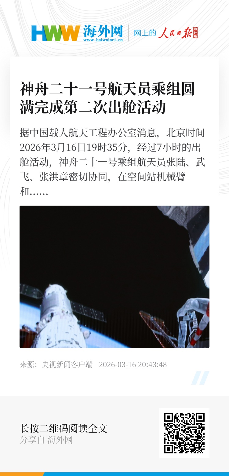 据中国载人航天工程办公室消息,北京时间2026年3月16日19时35分,经过7小时的出舱活动,神舟二十一号乘组航天员张陆、武飞、张洪章密切协同,在空间站机械臂和地面科研人员的配合支持下,圆满完成空间碎片防护装置安装等任务。出舱航天员张陆、武飞已安全返回问天实验舱,出舱活动取得圆满成功。航天员张陆已累计进行6次舱外活动,成为目前在舱外执行任务次数最多的中国航天员之一。