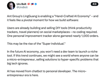 这种模式的爆发力在于其极低的门槛。一位海外网友在Urs Bolt的推文中精辟地总结道:“这代表了软件创作的民主化。在这个新时代,创造力和洞察力比企业规模更重要。”