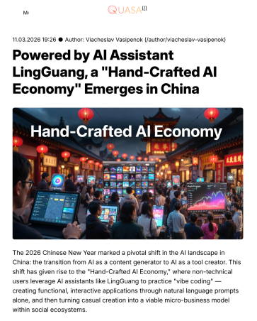 近期海外科技媒体QUASA报道,在中国普通人正在利用灵光等AI工具 “手搓”出各种功能性、可交互的小应用,并在社交平台上把这种日常小应用进行售卖,打造成了具有可行性的轻量商业模式。QUASA认为,“手搓经济”正在中国悄然兴起,软件开发或将迎来转折性时刻。
