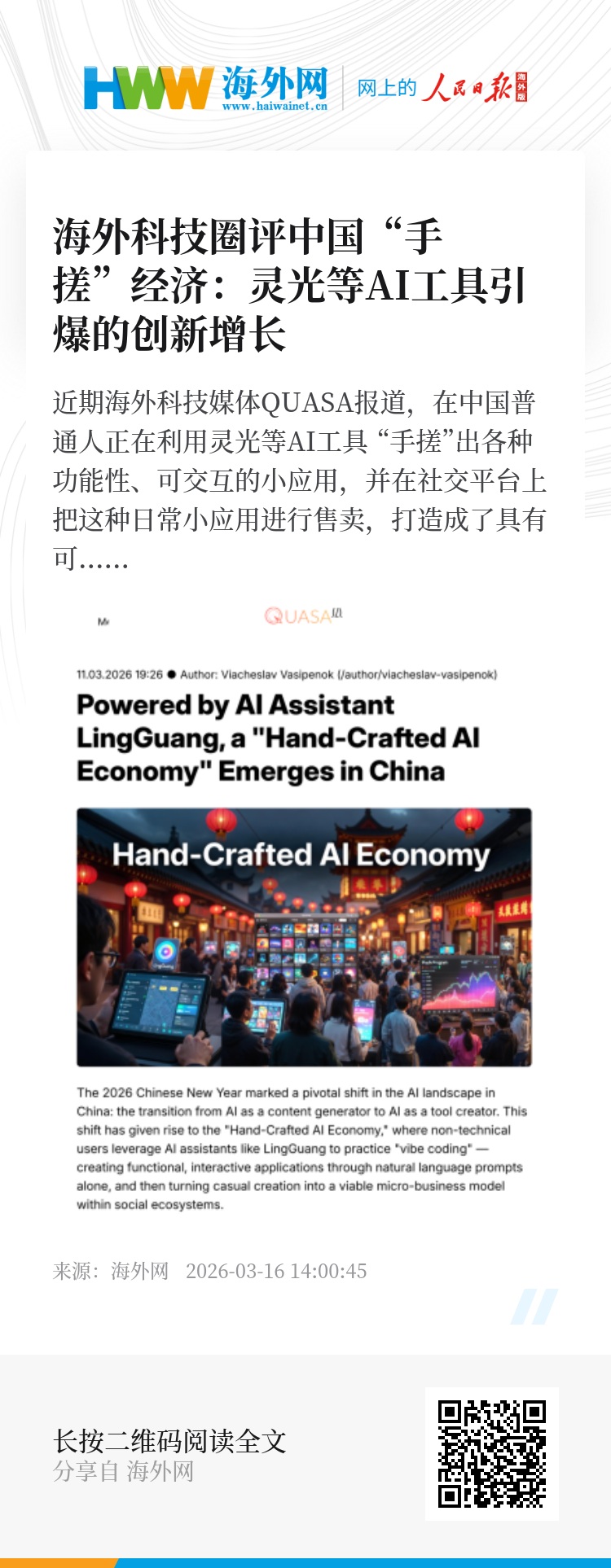 (QUASA报道中国“手搓经济”)