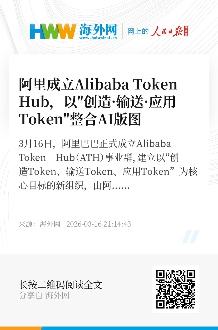 3月16日,阿里巴巴正式成立Alibaba Token Hub(ATH)事业群,建立以“创造Token、输送Token、应用Token”为核心目标的新组织,由阿里巴巴CEO吴泳铭直接负责。