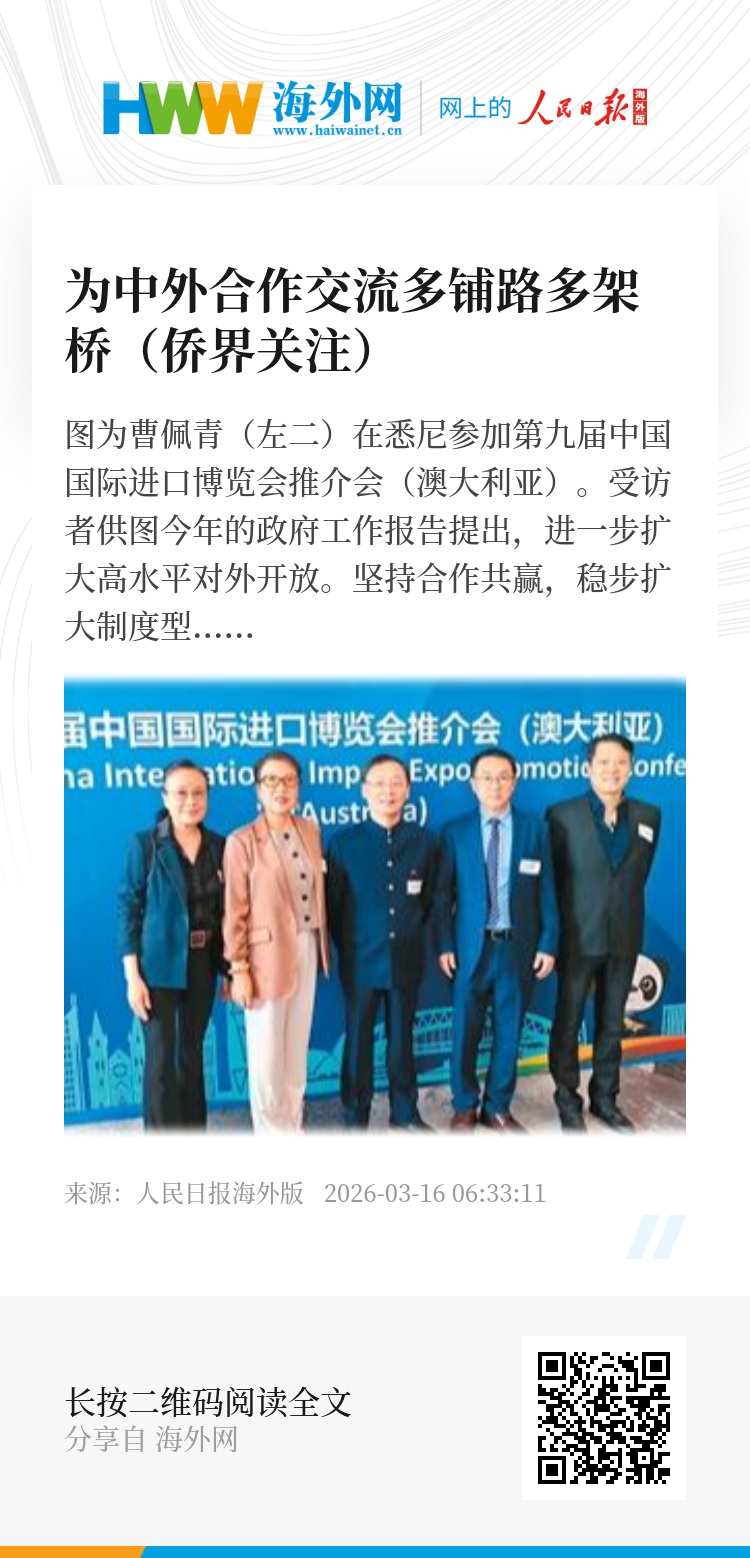 “明天,我要接待来自上海的杨浦区政府代表团,安排他们和澳大利亚企业交流。”3月10日,在接受本报记者采访时,澳大利亚悉尼上海商会名誉会长、CPG集团董事长曹佩青正在为第二天的接待工作做准备。她对此类工作早已驾轻就熟:“近年来,通过组织企业交流、商务考察以及参与进博会等,我积极推动中澳两国在文化、贸易和创意产业领域的交流合作。此外,我们也探索通过数字平台和文化创意产品,加强两国在品牌、设计以及绿色生活方式领域的合作。”