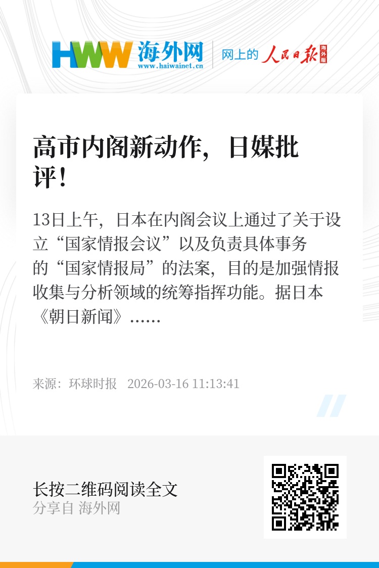 对此,日本《信浓每日新闻》13日的社评批评称,高市政府的这一动向,让人想起在1940年,即太平洋战争爆发的前一年,内阁情报部被提升为内阁情报局的历史。在当时,日本的情报与治安机关凭借巨大的权力压制言论与思想自由,并通过控制情报来动员民众走向战争。日本不应重蹈这样的覆辙。我们应当再次确认:战后日本之所以没有建立统一集中的情报与治安机构体系,与日本宪法所倡导的和平主义理念有着密切关系。