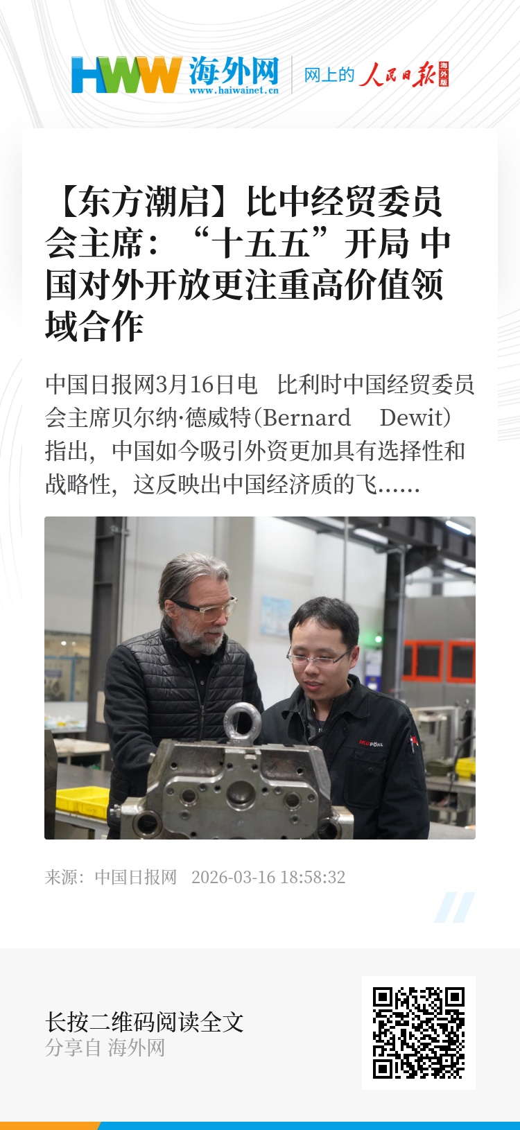 德威特在接受《中国日报》专访时表示:“早期阶段的对外开放主要侧重于扩大市场准入和吸引外资,而如今则更具选择性和战略性。中国正大力鼓励对高科技、绿色技术、生物技术、机器人和先进制造业等特定高价值领域的投资,这反映了中国经济的质的飞跃。”