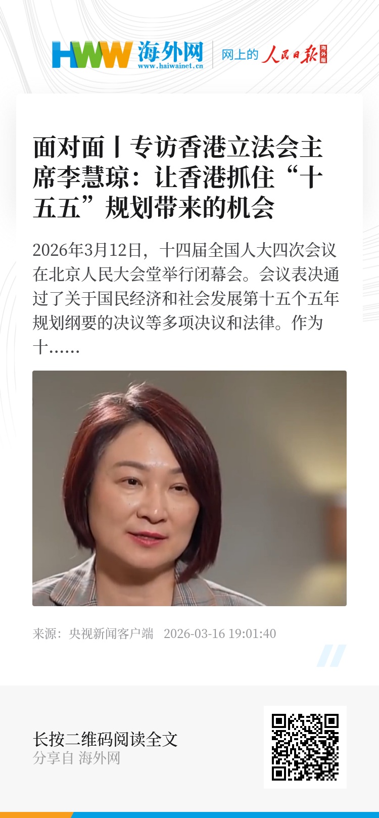 李慧琼:这个对香港来说是一个非常宝贵的机遇,如果能抓得住,香港一定可以贡献香港所长,为强国建设贡献力量,因为国家已经定了一个五年的工作方向,我们也要加快建设创科中心,也要把国际高端的人才聚集在香港,吸引更多海外企业通过香港进入内地,也可以让更多内地的企业,通过深圳跟香港走出去,其实纲要里面要求我们,除了融入国家发展大局以外,还要服务国家发展大局。